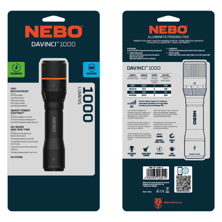 The DAVINCI 1,000 lumen rechargeable flashlight by NEBO is a powerful handheld flashlight with 4 light modes. The included mode selection dial makes it easy to switch between modes and the powerful LED in this flashlight can light up 299 meters. The included battery allows for up to 20 hours of operation in between charges.