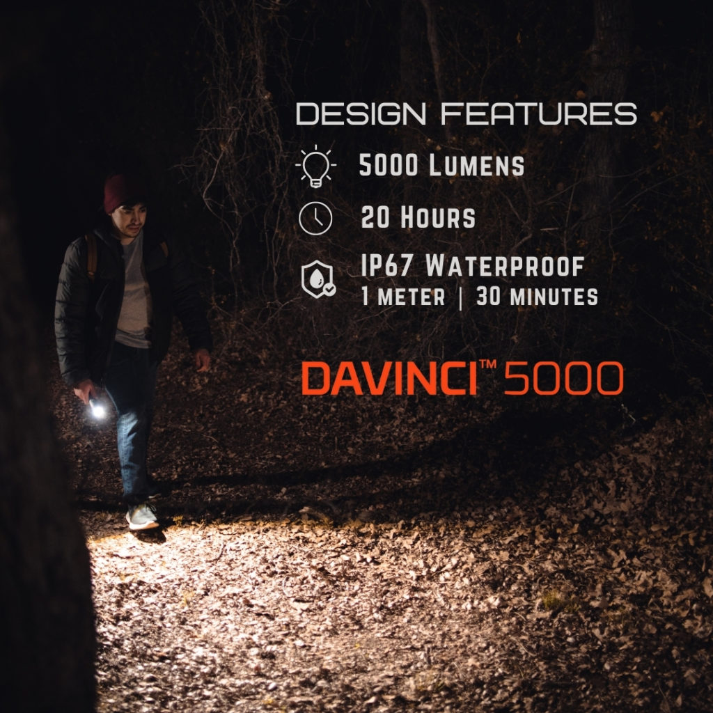 The DAVINCI 5,000 lumen rechargeable flashlight by NEBO is a powerful handheld flashlight with 4 light modes and an included power bank. The included mode selection dial makes it easy to switch between modes and the powerful LED in this flashlight can light up 192 meters. The included battery allows for up to 20 hours of operation in between charges.