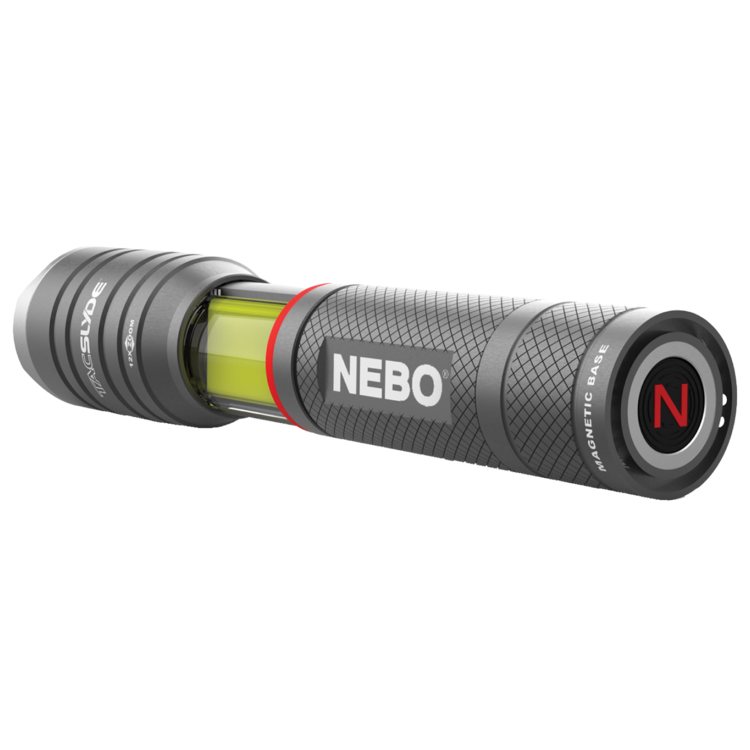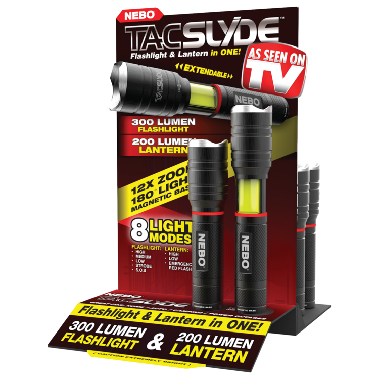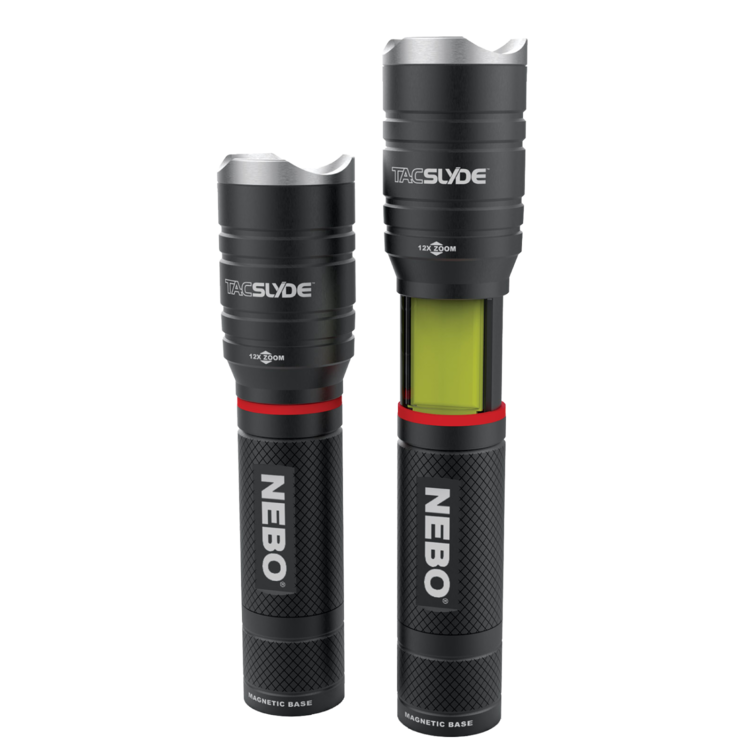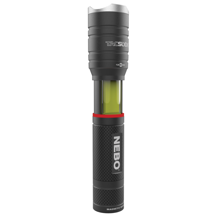 The Tac Slyde™ features a 300 lumen flashlight with 12x adjustable zoom and 5 light modes. A C•O•B lantern feature with 3 light modes, including emergency red flash, is also available upon extension of the light. A powerful magnetic base provides convenient hands-free lighting, and the lanyard helps keep this light handy when you need it most.